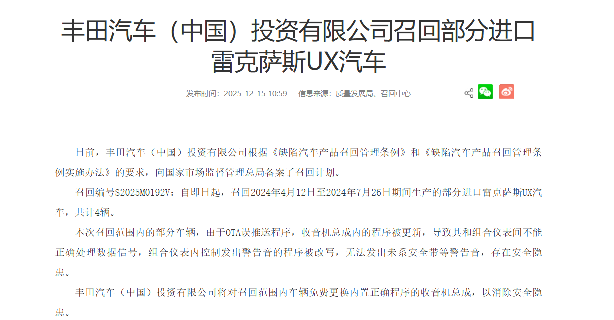 更值得关注的是,就在同一天,丰田公司还因另一车型的“全景监控系统控制程序设计不当”发起了另一起召回,涉及车辆数量近十万辆。这些事件共同指向一个趋势:软件故障是否正成为汽车产品缺陷的新兴多发领域,值得观察。